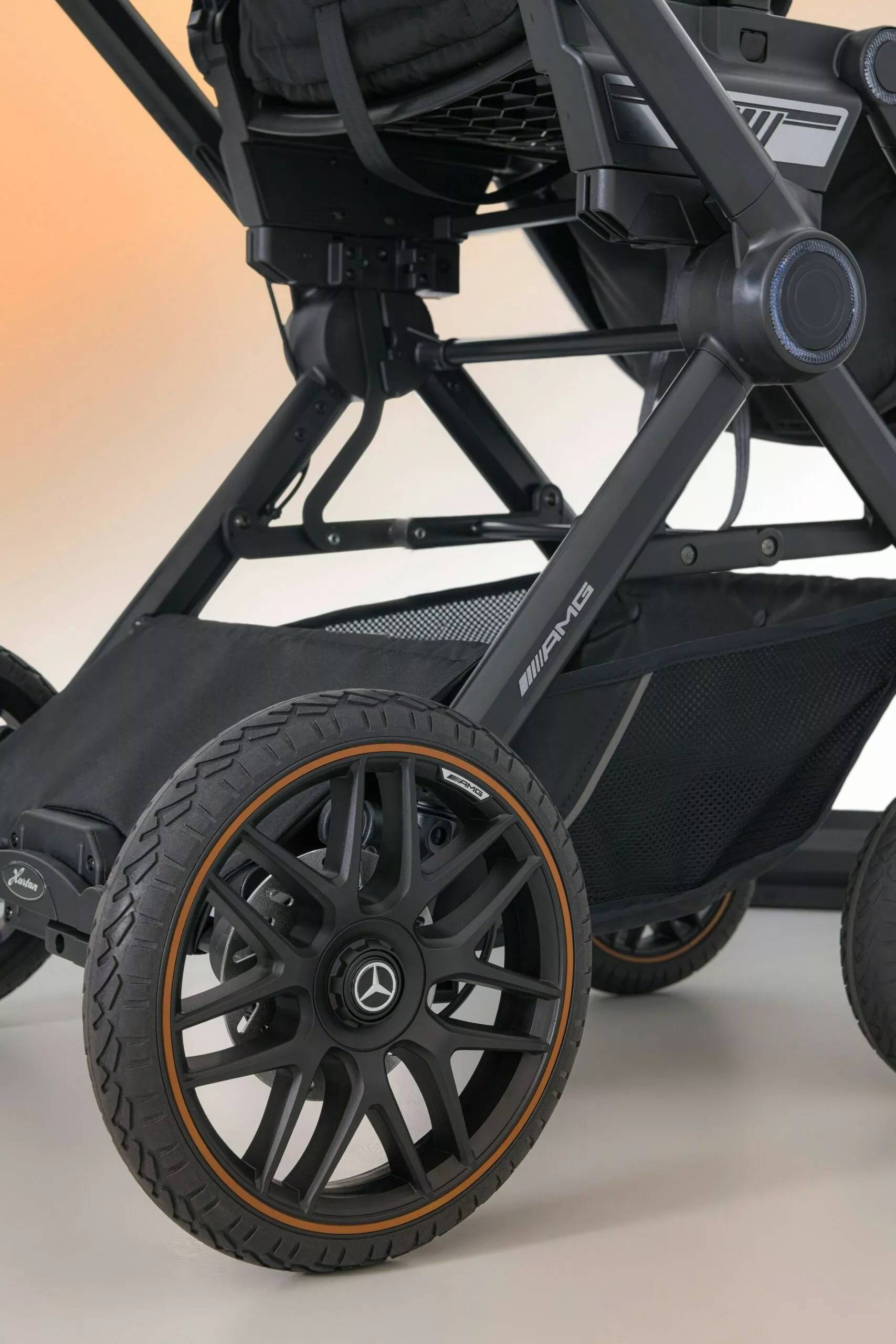 而 Mercedes-AMG GT2,虽借用了高性能跑车 AMG GT 的命名,实则定位为一款紧凑型城市推车。它可轻松折叠后放入奔驰 C 级或 A 级车的后备箱,并复刻了 AMG 标志性的交叉辐条轮毂、酒棕色缝线与专属徽标,将赛道基因融入了育儿场景。